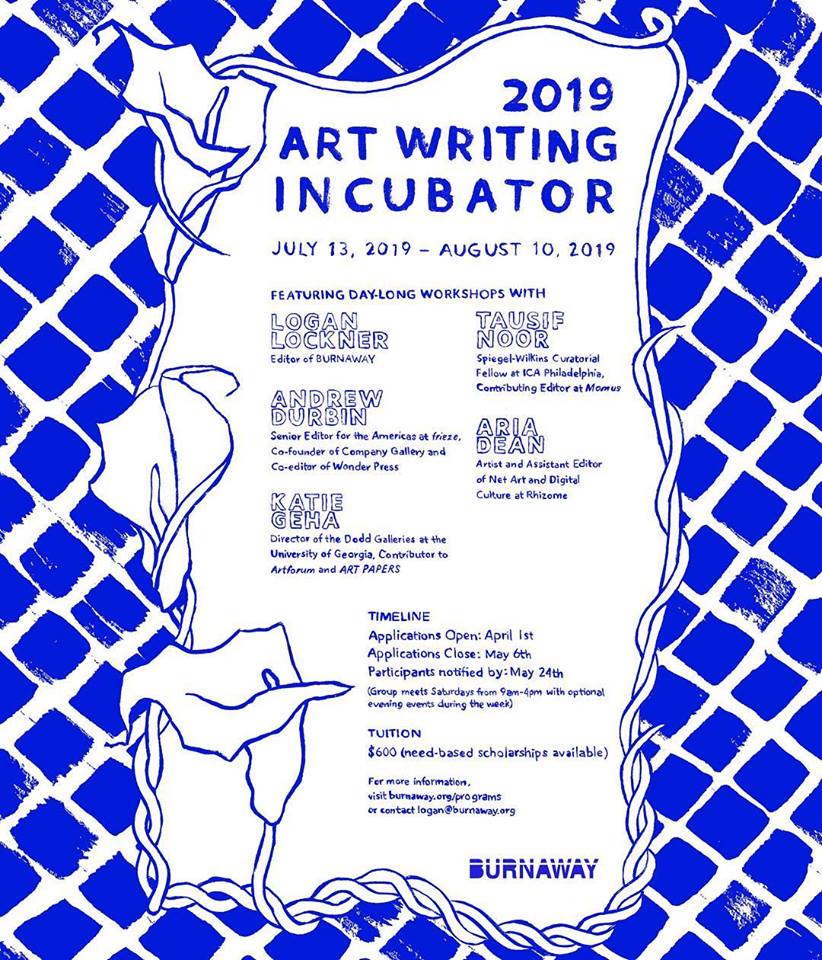 BURNAWAY’s annual professional development intensive, Art Writing Incubator, will return for its seventh cycle in Summer 2019. Over the course of five weeks in July and August, selected participants will strengthen their abilities as writers, develop professional practices for editorial environments, and study the history of magazines and alternative publishing within the broader context of contemporary art.