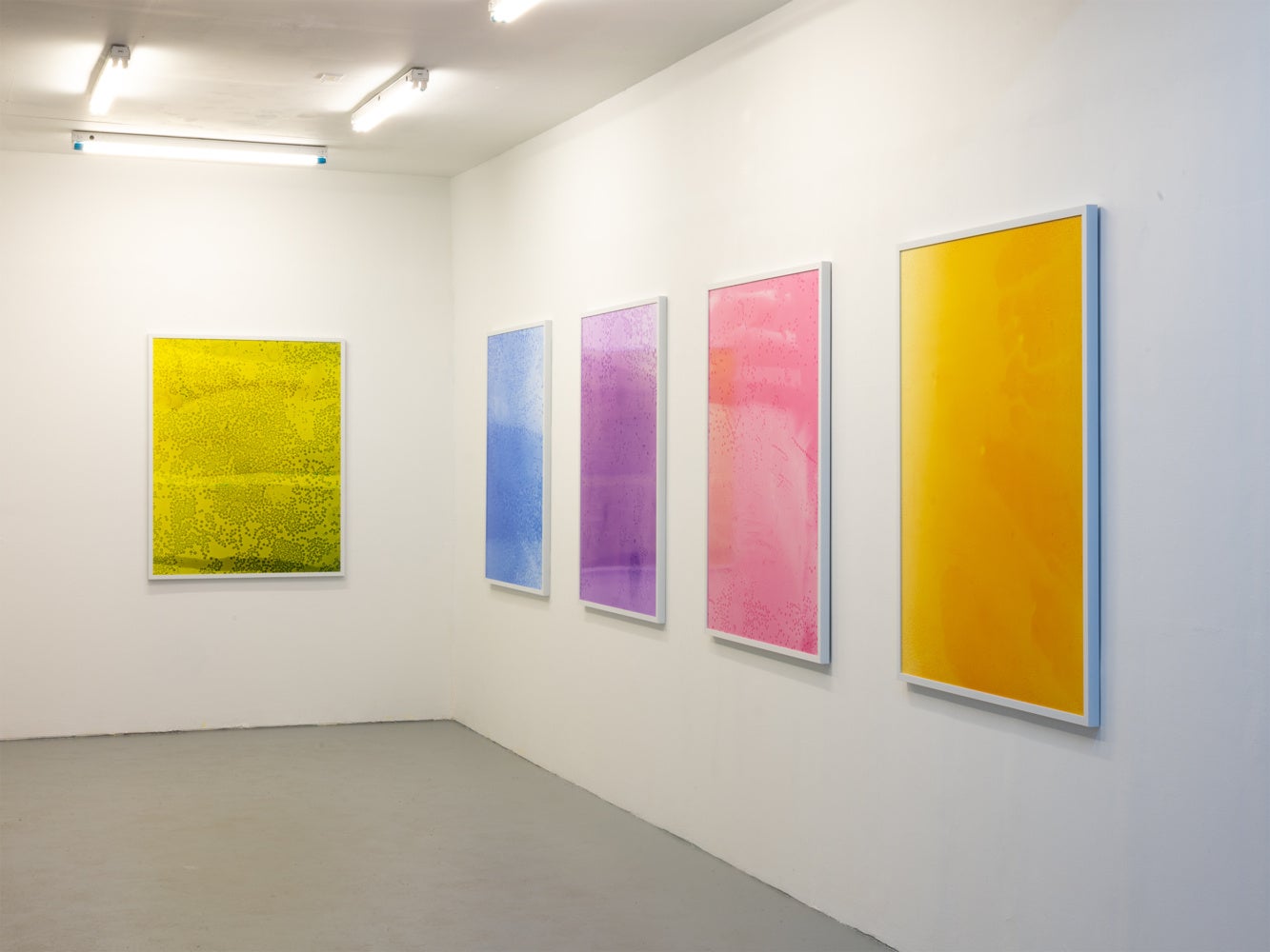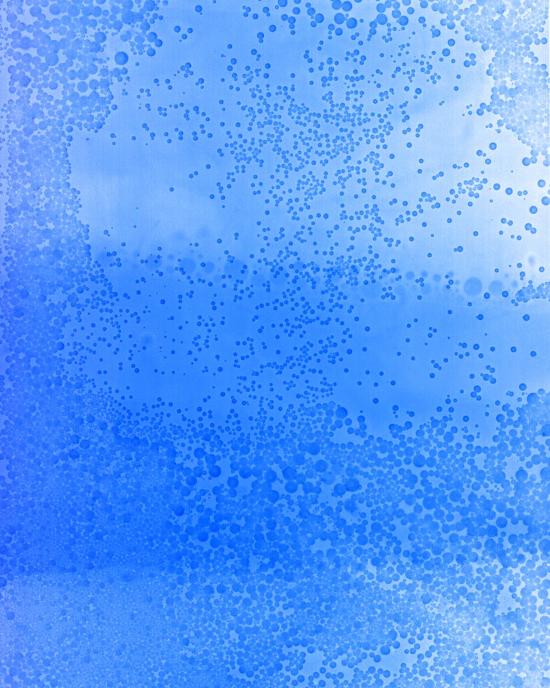 One of Mountain Dew’s appeals is the fluorescent color; a walk to a corner store reveals a spectrum of hues displayed in clear plastic bottles and aluminum cans. Landenberger’s process emphasizes the formal qualities of this corner store experience, removing the frivolous marketing and reducing the drink to pure color. The works render the soda through cameraless exposures in a darkroom, placing large format color film in a tray of Mountain Dew and then setting off a brief exposure of light while submerged. The resulting images are effervescent color fields, printed fifty inches tall to reveal subtle variations in value and carbonation.