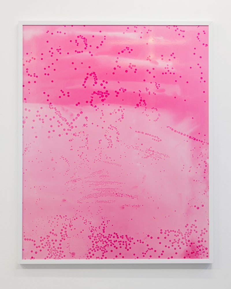 Stepping back, the emphasis on color and the serial arrangement resemble a makeshift Gay Pride flag, the first iteration of which is attributed to artist Gilbert Baker. Baker assigned each color a specific meaning, meanings which still linger as the flag becomes a larger palimpsest for contemporary LGBTQ+ discourse. In the original design, pink represented sex; Landenberger’s pink represents Mountain Dew Major Melon. I like the contradiction presented by Landenberger in reclaiming the soda through a queer sensibility, and that this involves removing it from its fraternal feedback loop and presenting it as an isolated substance.