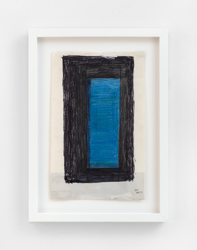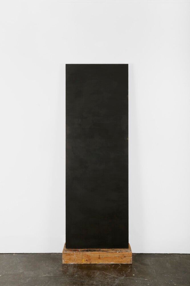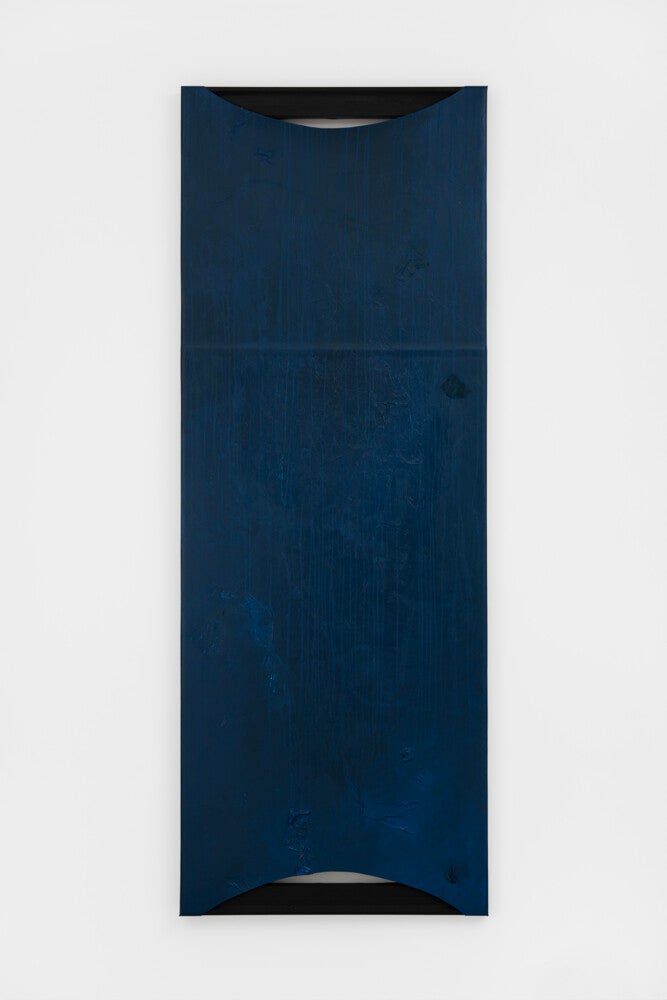 In this cycle of comparisons are long, thin compositions, vacillating between black and blue, and shifting between the canvas acting as a body or a window. Sylvester’s Offering (Deep Blue) and Hurley’s Portal J2#1 felt like bodies, their surfaces mirroring taut skin. Whereas Hurley’s Portal and the Deep Blue #1 and Sylvester’s Semi 004 act more like apertures, mostly because of the presence of a figure/ground relationship. This tension between the actuality of the surface and suggestions of implied pictorial space is at the center of twentieth-century abstraction. So too is the tension between the painting as a readymade (a thing in itself) and as a picture (a thing that points to something outside of itself).