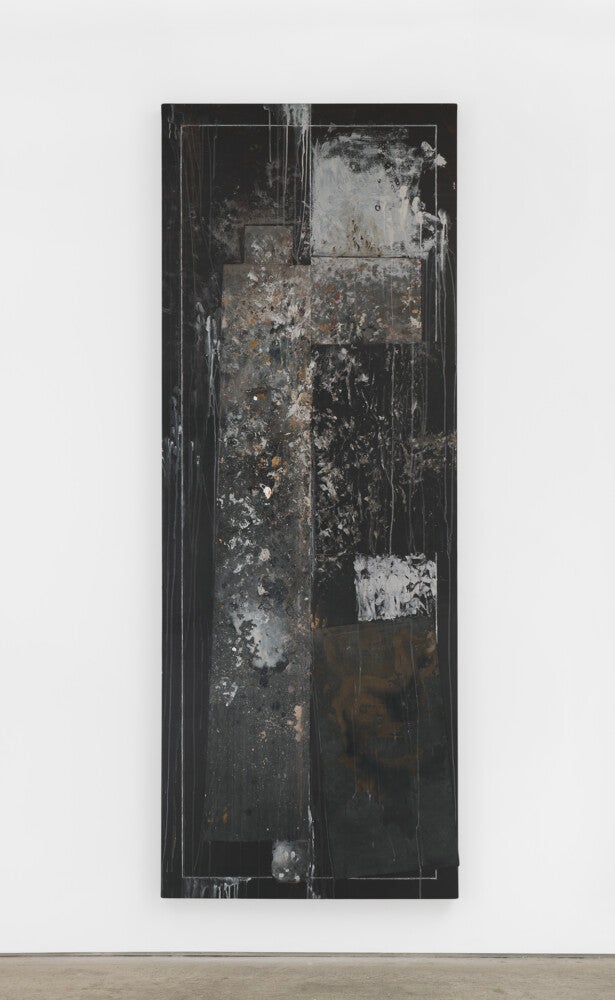 Sylvester’s Offering (Deep Blue) (2024), a tall vertical canvas, cut and stretched to reveal black stretcher bars on its top and bottom, is juxtaposed next Hurley’s Portal and the Deep Blue #1 (2012), a small work on paper in which a blue vertical rectangle is surrounded by another rectangle made by an accretion of black marks. In the next room is a work by Hurley that is a long, thin black vertical rectangle, propped on a paint splattered wooden box called Portal J2#1 (2015-17). Next to that is a long, thin vertical work by Sylvester, Semi 004 (2024), with hundreds of marks made on a black ground with what looks like umber, burnt sienna, and a range of grays.