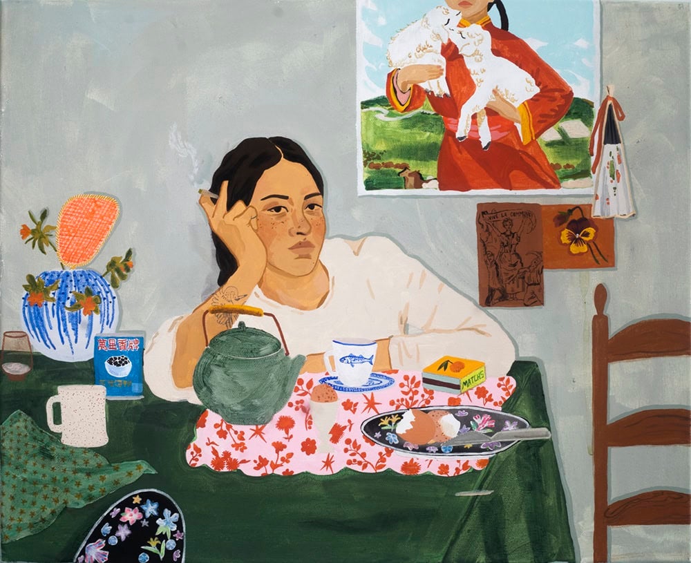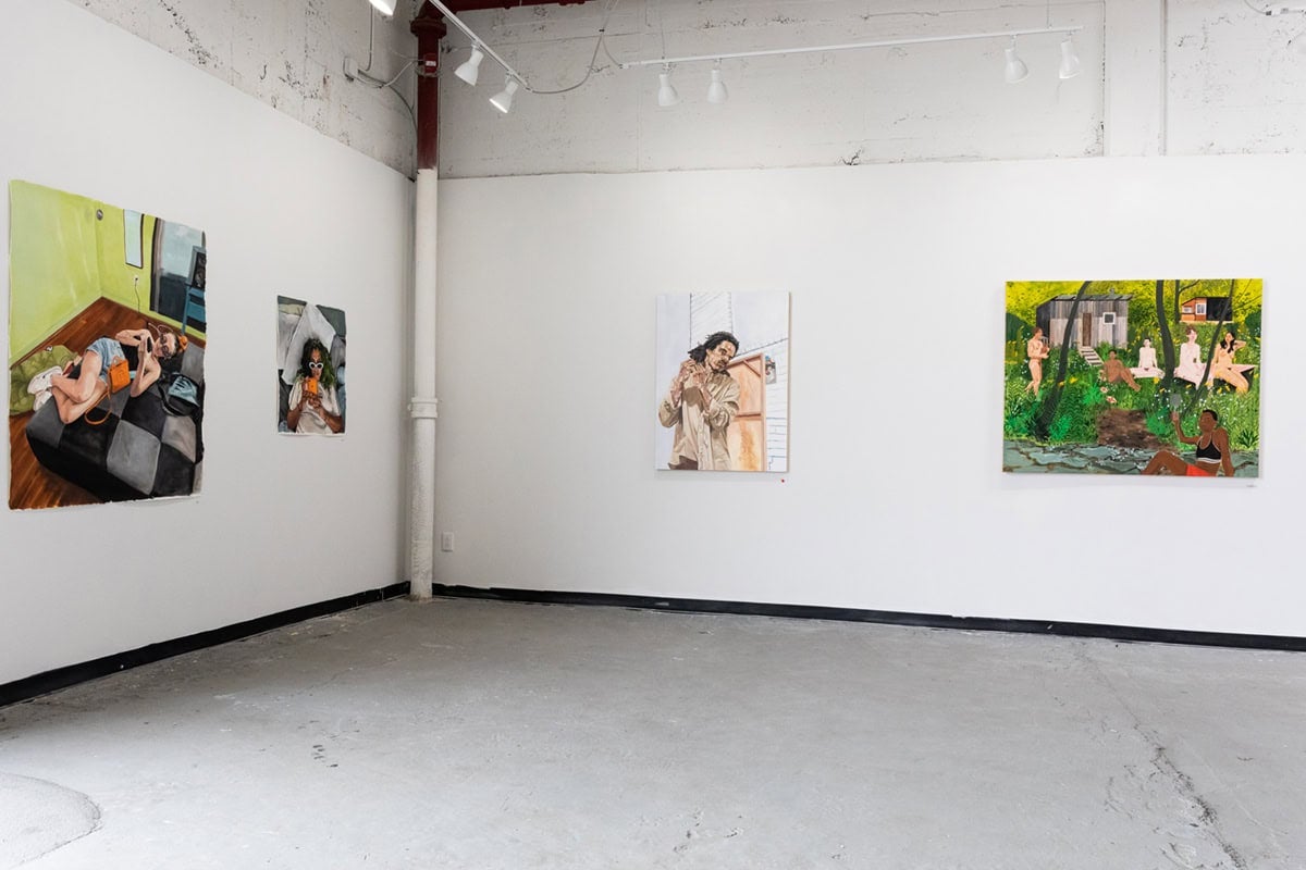 Titled like diary entries, Dianna Settles’ paintings further emphasize simple moments of solitude or communion through explicit place-making, leaving no detail out. People and places are specified, tattoos are mapped true to form, and each inanimate object is depicted exactly as it is, text and all. The mapping of space is often flattened too, like in Self-portrait after Elin Danielson-Gambogi’s ‘After Breakfast’. This work calls out to Matisse’s Harmony in Red, with striking similarity between the condensed table setting swirling full of patterns, the placement of a wooden chair, and an image on the wall much like a window. What I found most fascinating in Settles’ works is the use of pencil to further the details of each painting. Pencils are used to fill in windows, tattoos, shoes, or rocks scattered about the ground. The pencil picks up wood grain from the painted panels and begins to look like a texture or second skin, as if the ground itself hasn’t quite rendered correctly. Her utmost consideration for specific place-making is transformative, and we, the flâneur, are permitted into these intimate moments.