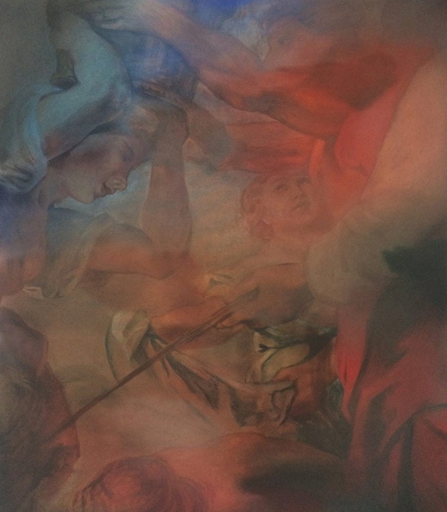 “Alexander’s Dark Band” is the dark area that appears between two rainbows in the event of a double rainbow. The paintings in Alexander’s Dark Band look at the history of painting in two ways and use a monochromatic or multicolored spectrum to do so. With a veil-like quality on the surface of each work, digital images of these paintings are very difficult to capture, and the eye continues to search for what it’s seeing.