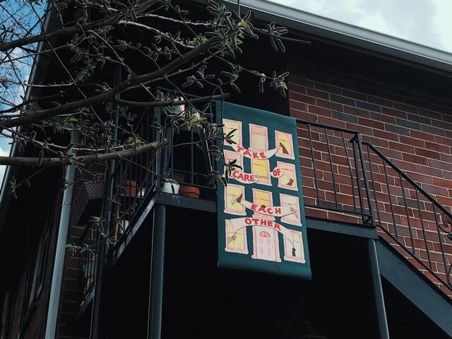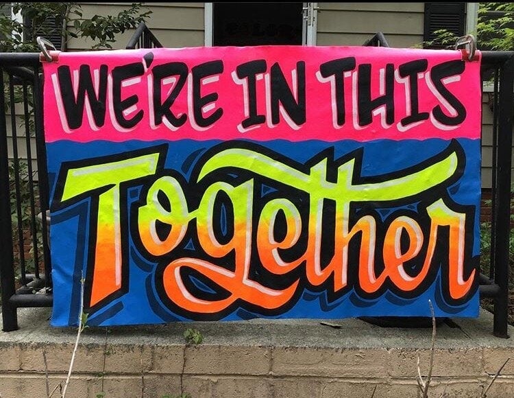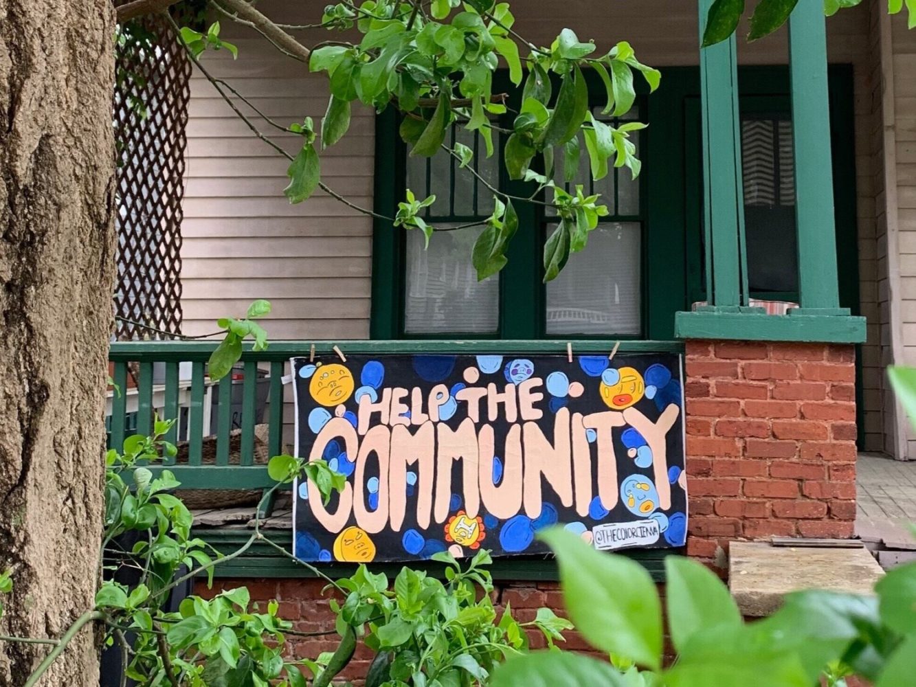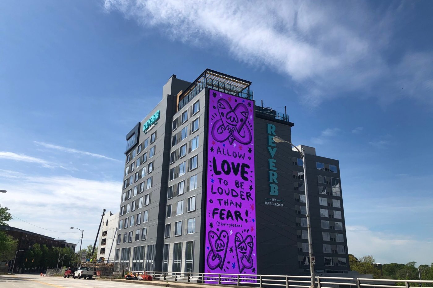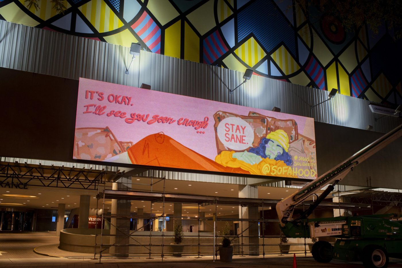 Reviving the program Signs of Solidarity, which originally launched in the run-up to Donald Trump’s inauguration as president in early 2017, Atlanta street art nonprofit Living Walls has commissioned thirty artists to create new Signs of Solidarity during the ongoing period of social isolation in response to COVID-19. Twenty-five of these artists have created hand-painted banners that are displayed across the city, and five artists designed digital banners in collaboration with Orange Barrel Media in Downtown Atlanta.