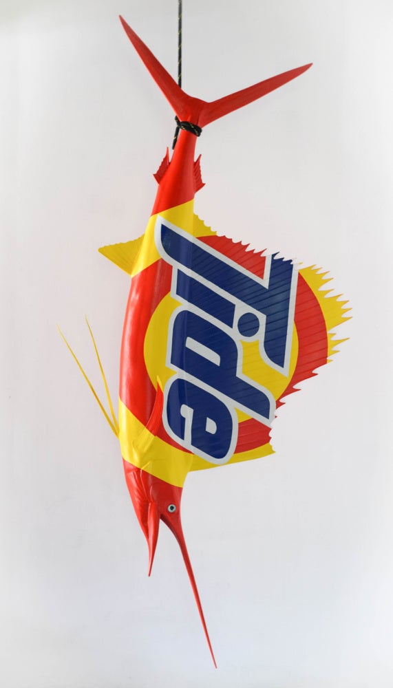 Those views, and the art that results from them, are eclectic to say the least. There’s a lot of fauna, mostly sculptural, including a pair of literal “snow birds” by Monsieur Zohore, a New York and Baltimore-based artist, carved from ice and stuck in a windowed minifridge. Ryan Metke, who is also from New York, supplied a few sculptures, including a naturalistic steel bust of a pelican diving, Anatomy of a Feather, 2024. More attention-grabbing is his fiberglass replica marlin, emblazoned with the Tide detergent logo and given the punny title High Tide (2024), which riffs on a common piece of kitschy Florida decor.