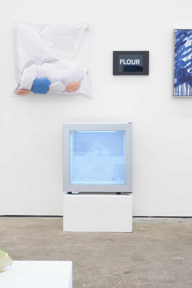 Uninspired references to drugs and Miami Vice also abound: Vice White (2024), a painting by Royal Jarmon of Brooklyn, included a mirrored white Ferrari from the namesake television show. Additionally, Soft Cocaine with Viagra and Alprazolam (2023) a soft sculpture by Al Freeman, another New Yorker, includes a baggie of pills and another kind of “snow.” Many in the Miami arts community have sought to position the city as a serious art destination; these additions suggest that some artists still view the place through the lens of coke-fueled Art Basel parties. Notably, none of the works on view seemed to have climate change on the mind.