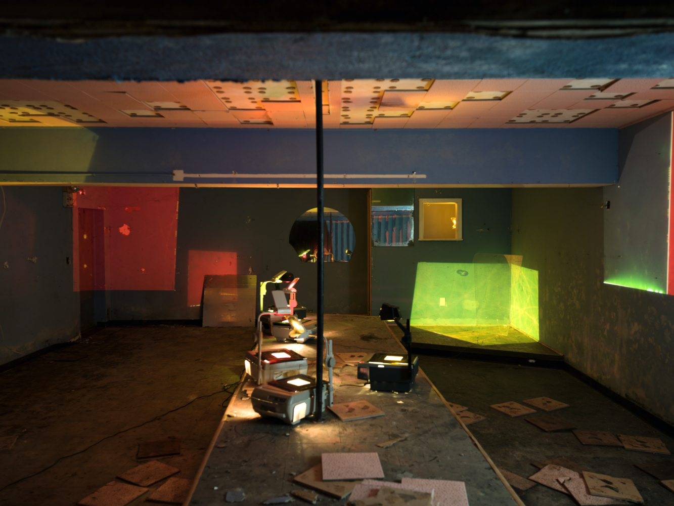 Some of the exposures seemed interesting, especially those with lasers, so I continued tweaking my approach and sending them off to a lab. It sat dormant for a while, and I returned to flesh out the work this spring. I used filters, tape, and mirrors to better control the light, as well as new lasers. One laser had a preset animation of a galloping horse, which felt like a funny [Eadweard] Muybridge reference—but also, who is projecting a laser horse?