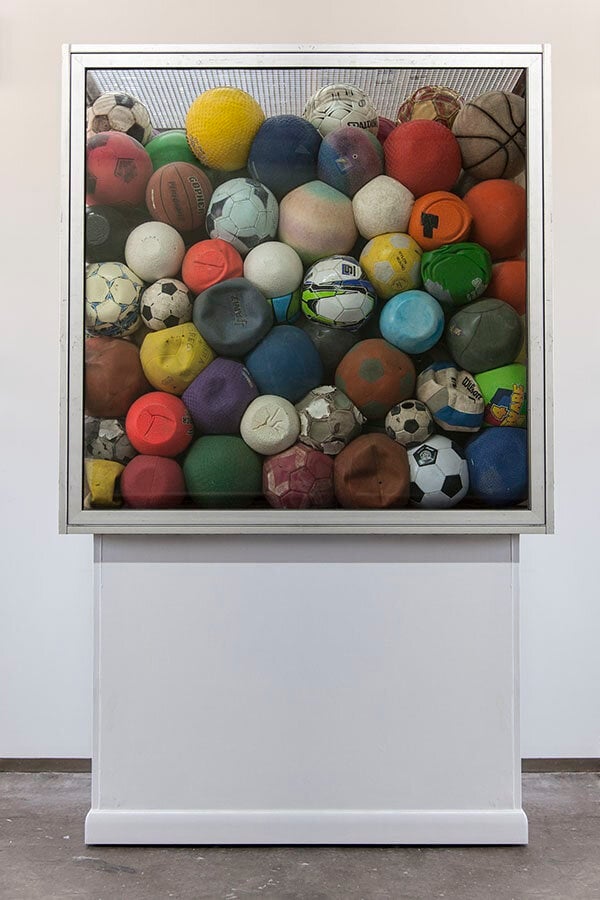 What is the most amusing, and the most perplexing, is that Ames’s work is strongest when it is either truly reductionist or truly conceptual. So Flaccid Paper, a sheet of paper taped to the wall along its bottom edge and drooping downward, is a laugh-out-loud work, as are Plopped Plaster — blobs of plaster dropped onto the floor —and Deflated Balls, a cluster of various types of sports balls arrayed in the gallery’s front corner. Maybe there is one too many penis references in the show, but this may just be a none-too-subtle swing at Minimalism’s machismo.