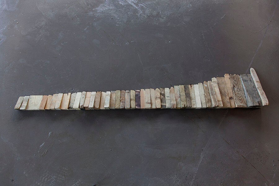 Ames’s exhibition is far more than a casual nod to his visual antecedents. He has distilled their conceptual essences down to a single visual trope, reconceived them, and made them manifest. Take Coupled Forms, for example. Here, two wire basket frames — complex polyhedrons that recall Robert Morris’s untitled works of 1967 — are intertwined on the floor. They are more intimate in scale, and play with the ideas that LeWitt so methodically explored, but for Ames these ideas are just a ground on which he has laid his new figures. On the back right wall, Sanded Wood (2015), a painted board — essentially a 2 x 4 — riffs on Donald Judd.