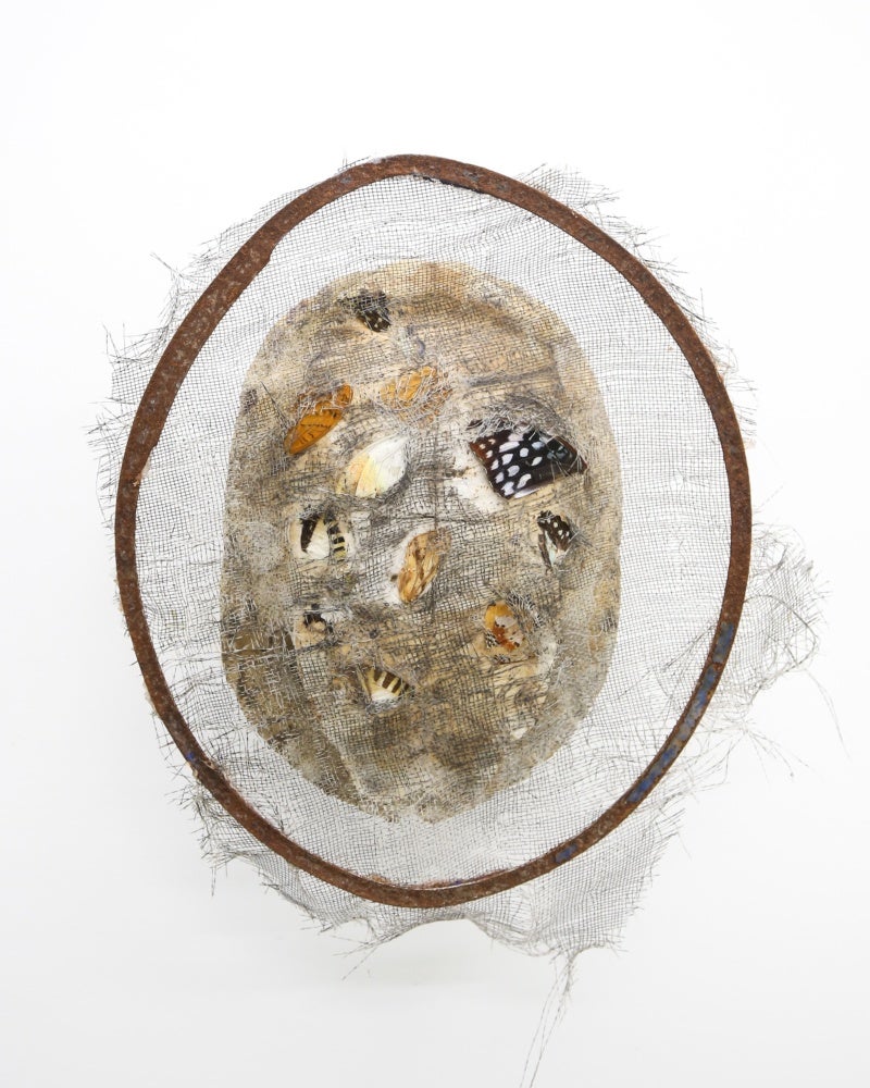 If Carroll’s work depicts an expansive view of nature and Ferlito’s hones in on specific aspects of winged species, then the work of Tristan Higginbotham bridges the two with a visceral and almost mutated response. Similarities can be drawn with The Shout (2025) where a red-eared slider turtle shell is mounted on the wall, its belly covered in a mesh with butterfly wings. It’s a sight not dissimilar to the set up for mothing. Higginbotham’s work appears delicate, sinewy, often symmetrical, giving the feeling of fossilized remains. If one is not repulsed by their use of animal remains, these works are a treat to behold and fascinating in their arrangement.