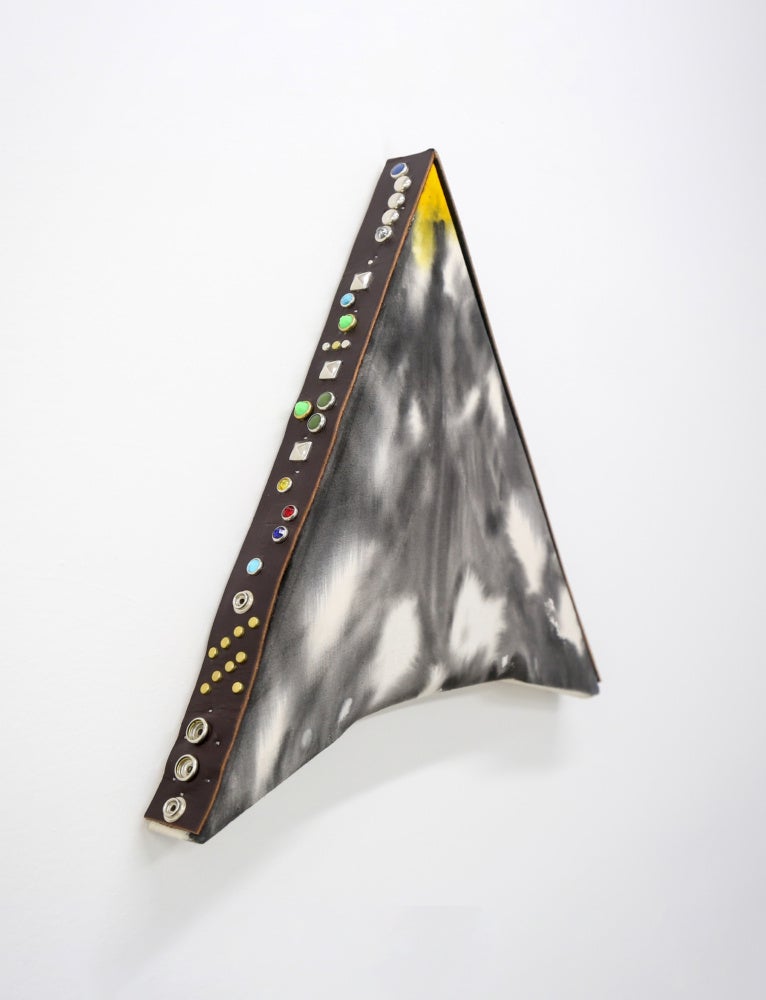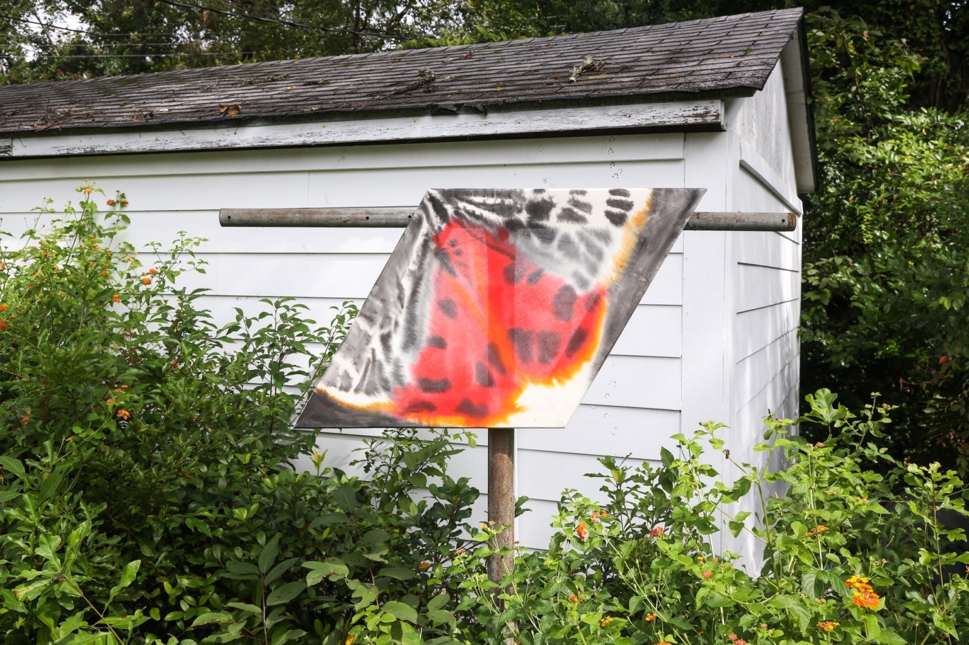 On the outside, Ferlito’s Virgin Tiger Moth (2023), a rhombus-shaped painting on muslin atop a pole, stands, jutting out from a blooming Lantana. Much of Ferlito’s work is like this throughout Rustle. Angular and geometrical arrangements of dyed fabric mimic specific moth’s wings and like the wing of a moth the works offer an airiness and serenity. However, in two pieces, one being Confused Haploa Moth (2023), the use of leather stands out in particular, in part due to a handmade belt wrapped around the top angled edges of the sculpture’s point. On said belt are sequins and plastic jewelry bedazzling the leather, ornamental and similar to a winged insect’s ability to attract or repel outside forces, be they prey, predator, or potential mate.