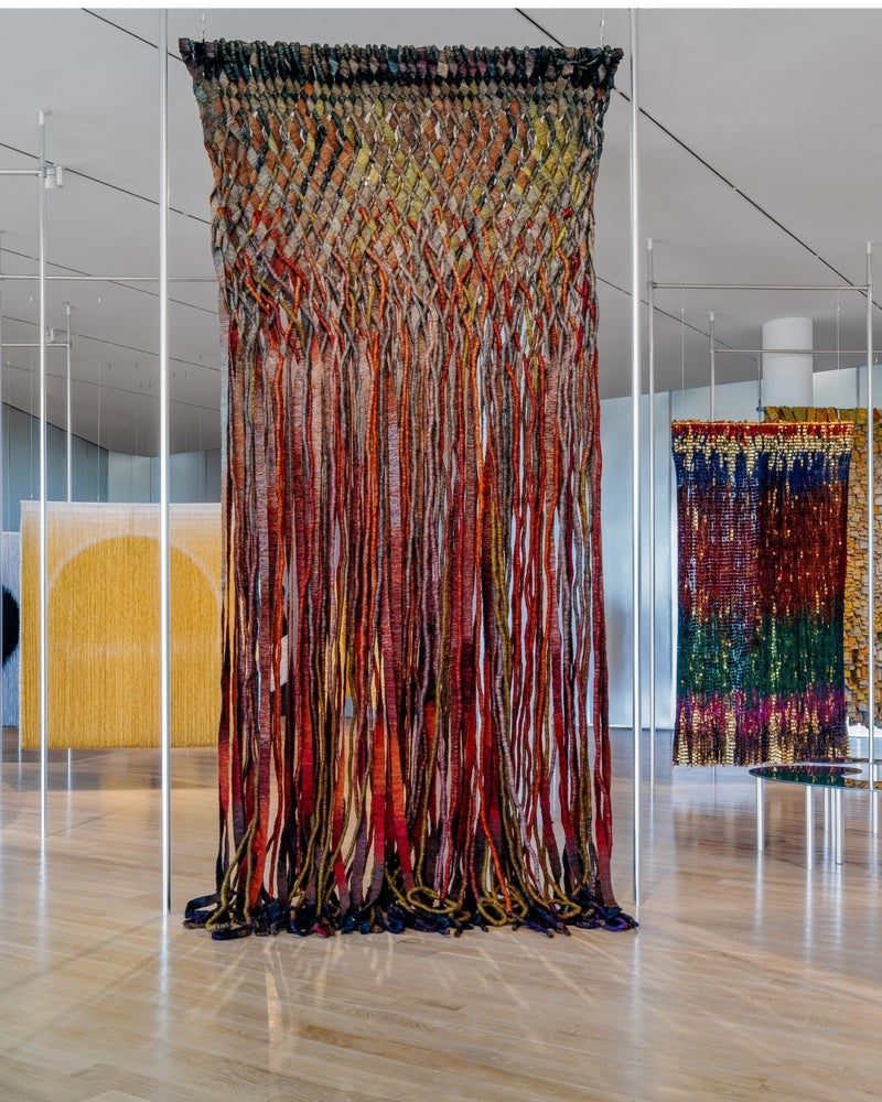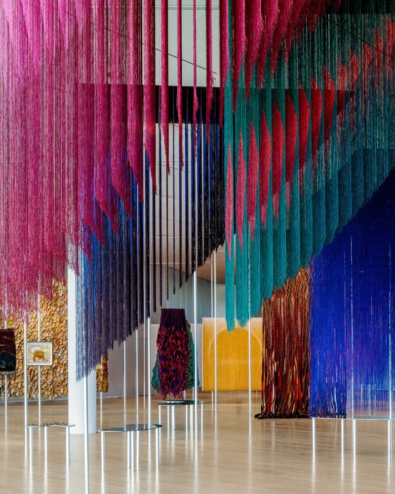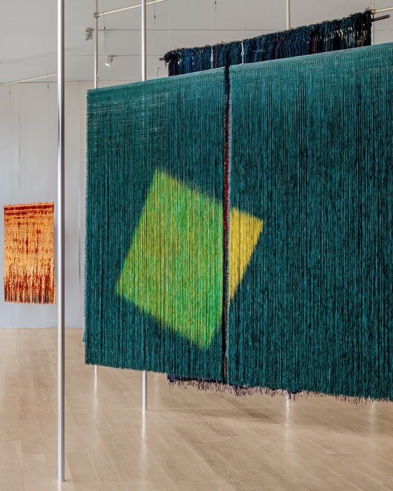 Sun and air sift through Amaral’s Brumas (Mists) (2013-2018), a geometric cascade of undulating fuchsia, azur, and forest green thread hanging from the ceiling. “I live color,” Amaral told Cranbrook. “It’s like a language to me. It’s part of my essence.”