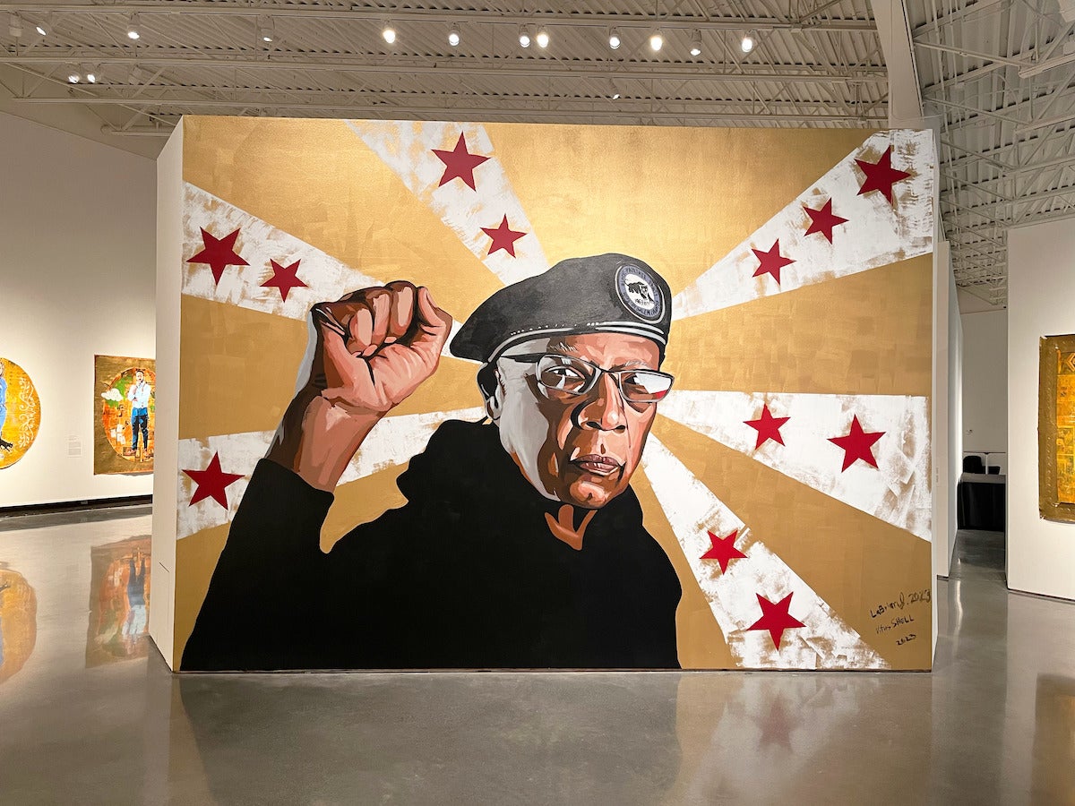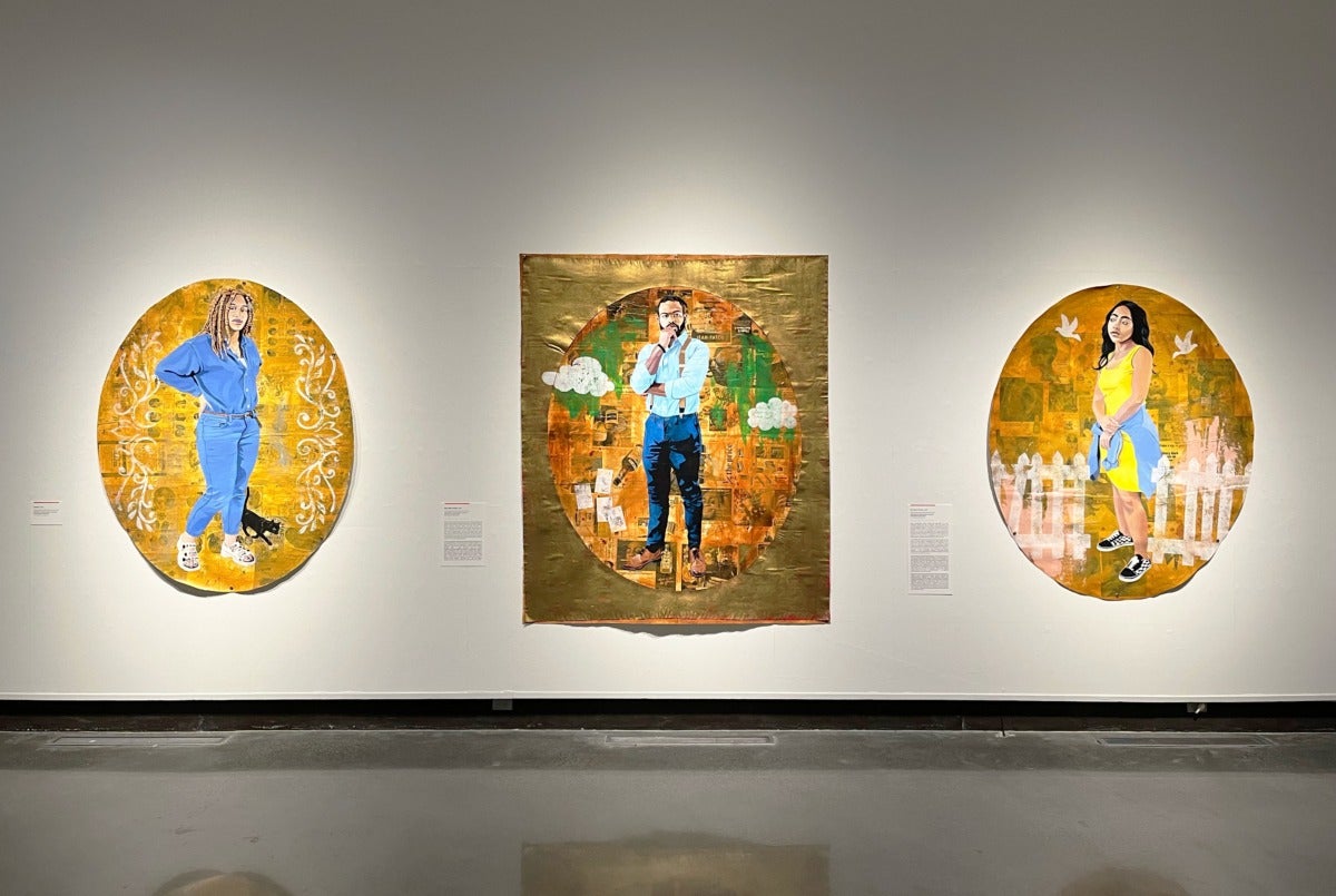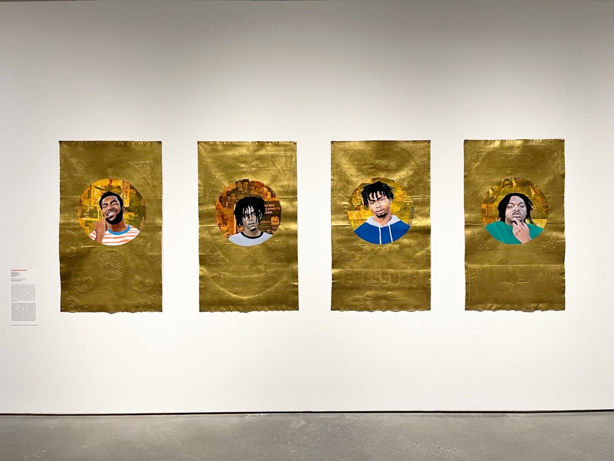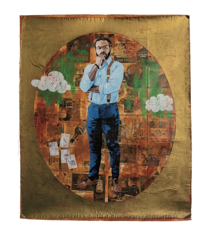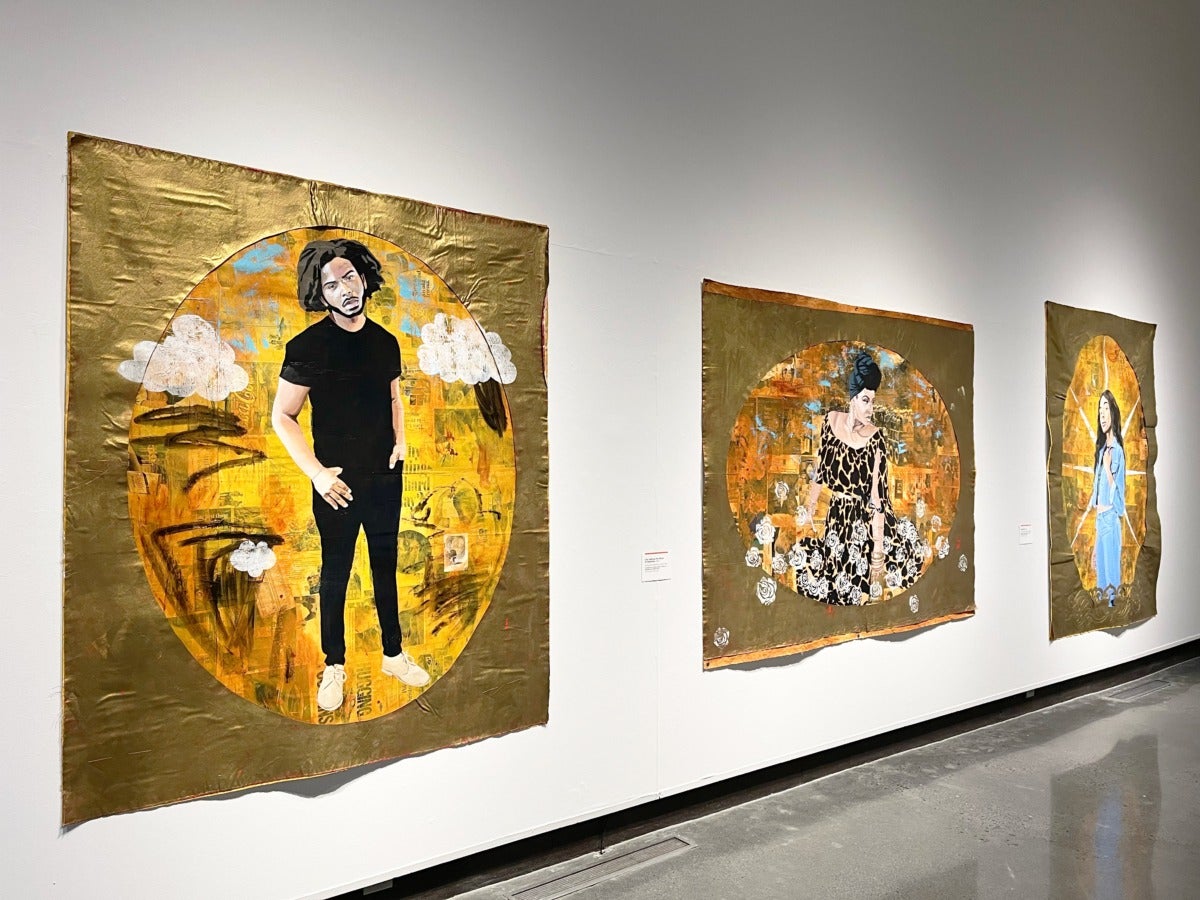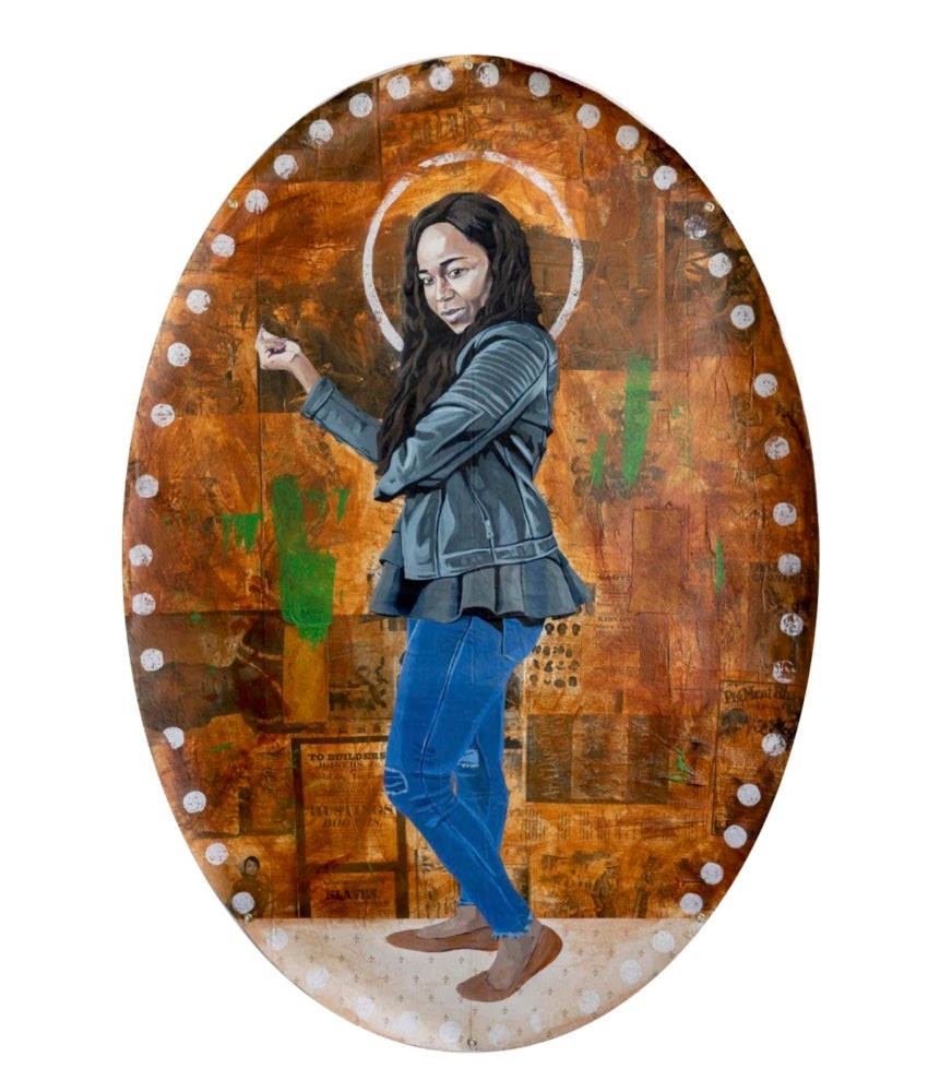 Portraiture as a genre holds a grand position within the history of art and has for centuries been employed to glorify white monarchs, leaders, icons, and religious figures. Louisiana-based artist Vitus Shell creates portraits that challenge this tradition, while also sharing a concern for the historical representation of Black bodies. For example, the composition of his portraits includes faux gold gilding and oval or circular picture windows—stylistic trends often found in Byzantine and Renaissance portraiture to indicate power, status, and the eternal. Shell also rejects the convention of framing his works. Instead, his canvases hang in an ad-hoc manner with grommets, boasting waves and slightly curled edges. The presentation implies a quickly wheat-pasted handbill for a trendy nightclub or a banner at a protest rally.