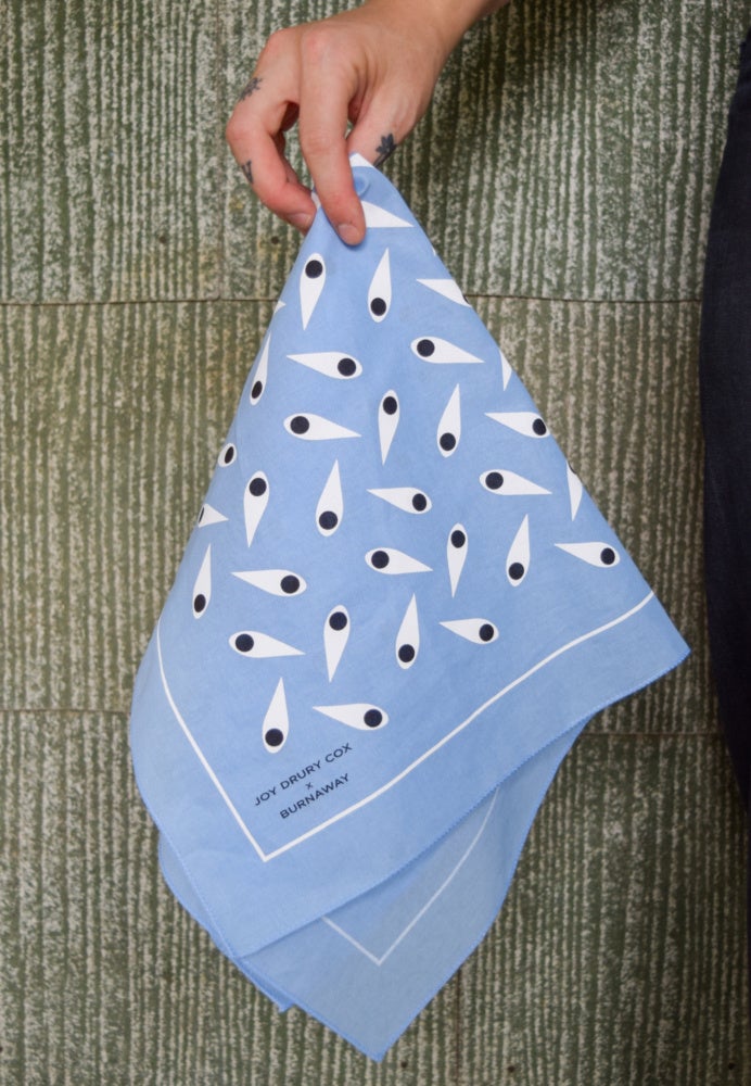 For our second Artist Edition, Carrboro, NC-based artist Joy Drury Cox designed Watching, Looking, Seeing, a limited edition of 50 bandanas inspired by the design of a neighborhood crime watch sign. Cox often appropriates mundane and bureaucratic structures in her artwork to critique their design and intended functions. She reworked the icon of a single eye into a pattern, echoing the ways in which the act of looking itself can become a rigid, rote, and potentially harmful process. At the core of this work, Cox asks viewers to reconsider what and how we watch, look, and see the world.