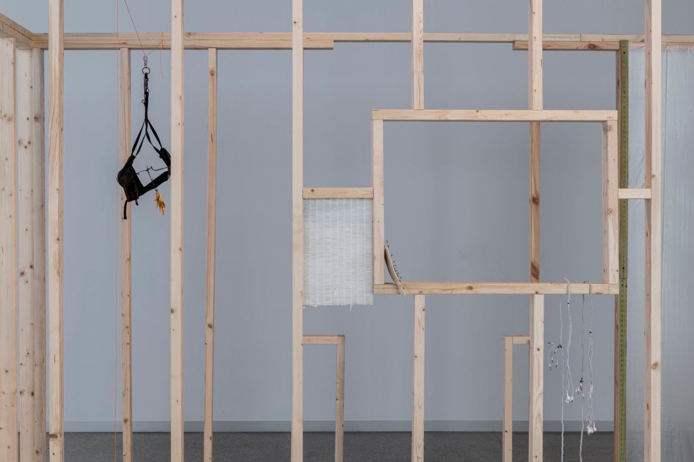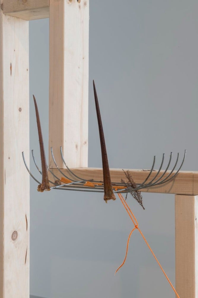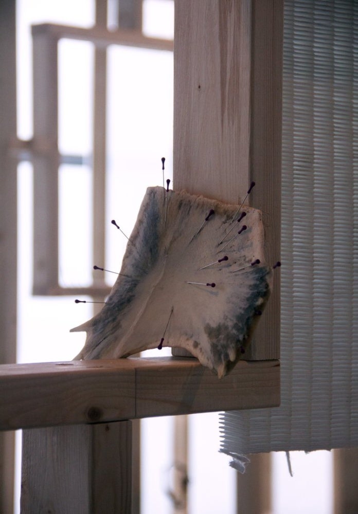 A sense of hasty abandonment whistles though the installation, countered by the painstaking arrangements of detritus. In the first room, an assemblage of light wooden planks recalls the early stages of construction for a cheap home. This is a direct reference to garcia’s past construction jobs. Two house framings mirror each other at slight remove. They are filled with animated detail. A piece of matte plastic has a liquid perpetually streaming down. Onion skins and paper are scattered through as if a gust of wind just blew in the galleries. These are rooms where something happens through an assemblage of mysterious objects that include deer bones, a butterfly wing, a stomped-on bucket with gallon of unidentified fluid, and many other crumpled and creased things stuck between trash (random) and sculpture (purposeful). A human presence is denoted by a coat hanger with a baby’s jolly jumper with protruding chicken feet on thin aluminum rods pointing to the floor. “The ghostly figure is as potent as the figure itself,” garcia asserts. When all the materials and objects align, an “ecstatic encounter” happens so that the absent person can be intuited through their ritualistic arrangement. The arrangement is intensely personal with its use of private objects, but the logic of their placement can be decoded by any hoarder who saves old notes, insignificant finds, and other stuff to keep mementoes of those who are gone.