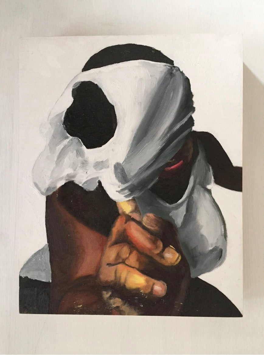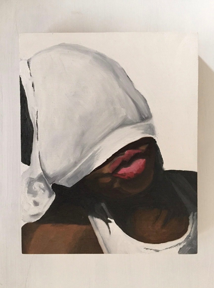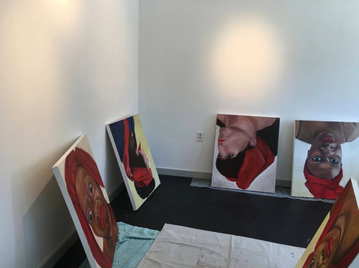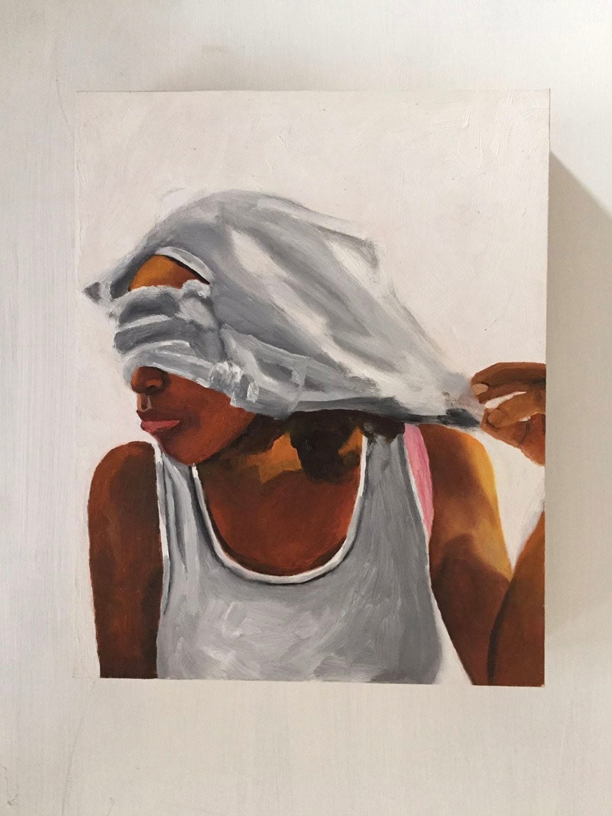 EC: Let’s talk about your previous series “Black Women Rock: Painting Black Female Experience.” You painted portraits of your friends wearing granny panties on their heads, often covering their eyes. Why did you make this decision?