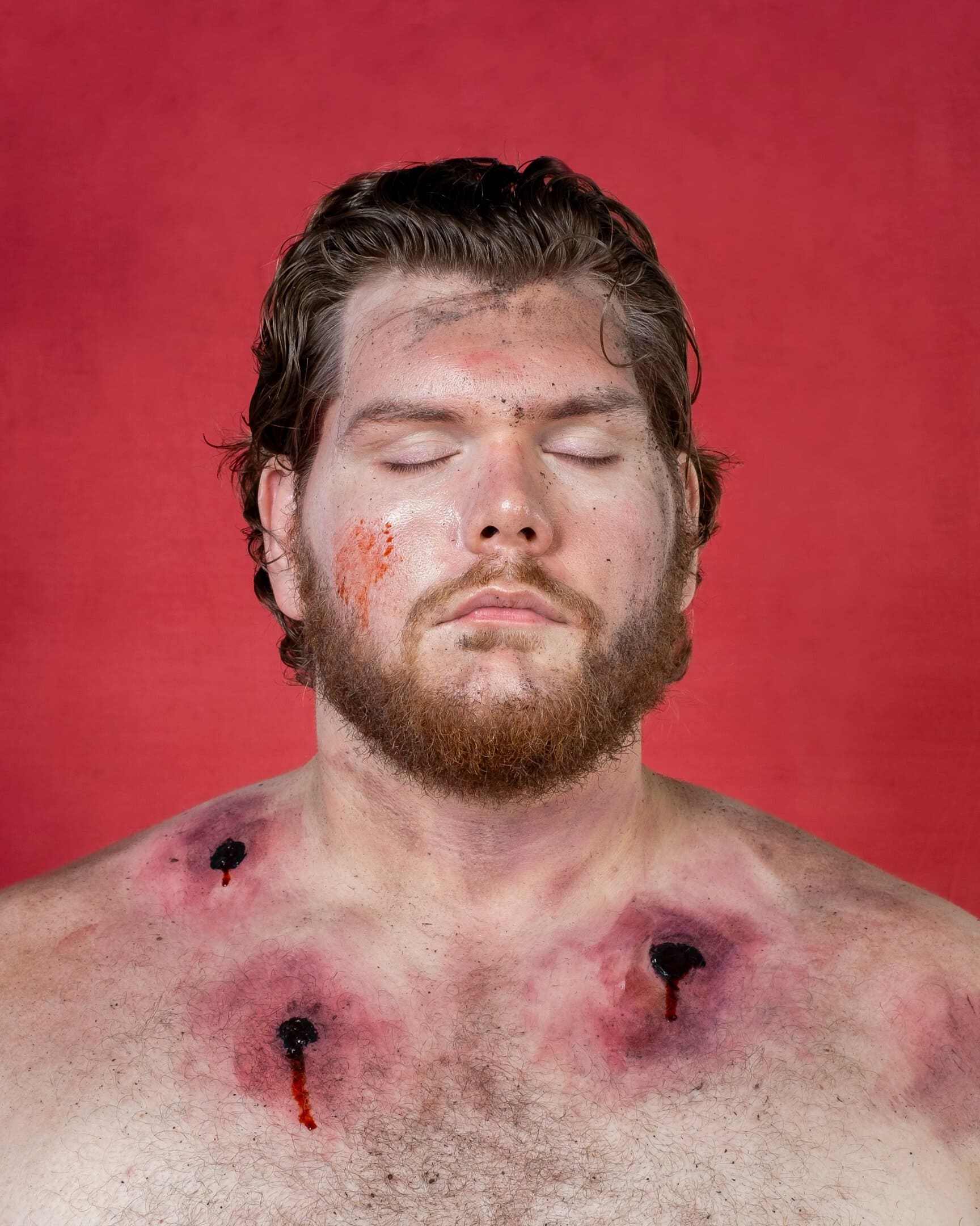SC: She did a series of photographs where she and her friends, being queer and or butch, took on different appearances of masculinity. It’s funny I don’t have any markers of being a cowboy in any of the photos. I don’t have a hat on or anything like that. It’s all in the title. And they’re not big. They’re 8 x 10 prints, so you can get up into them. With some of them I think you can tell they’re not real, but they’re pretty gory. I learned a lot about makeup and what not to do in my process of making this.