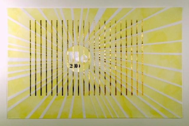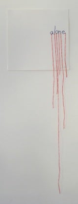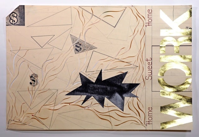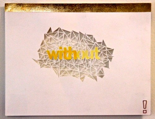 KB: My work is kind of difficult. Paper. I work with words. I also do video performance. My stuff is about communication, language, perception, conceiving of something. I use thread. I stitch. I gold leaf. I cut. My stuff is about affecting the paper. If it is gold leafed it means something, if it is stitched it means something, if it’s typewritten it means something. Take the sampler, Home Sweet Home. What happens when you put something stitched next to something that is media driven?
