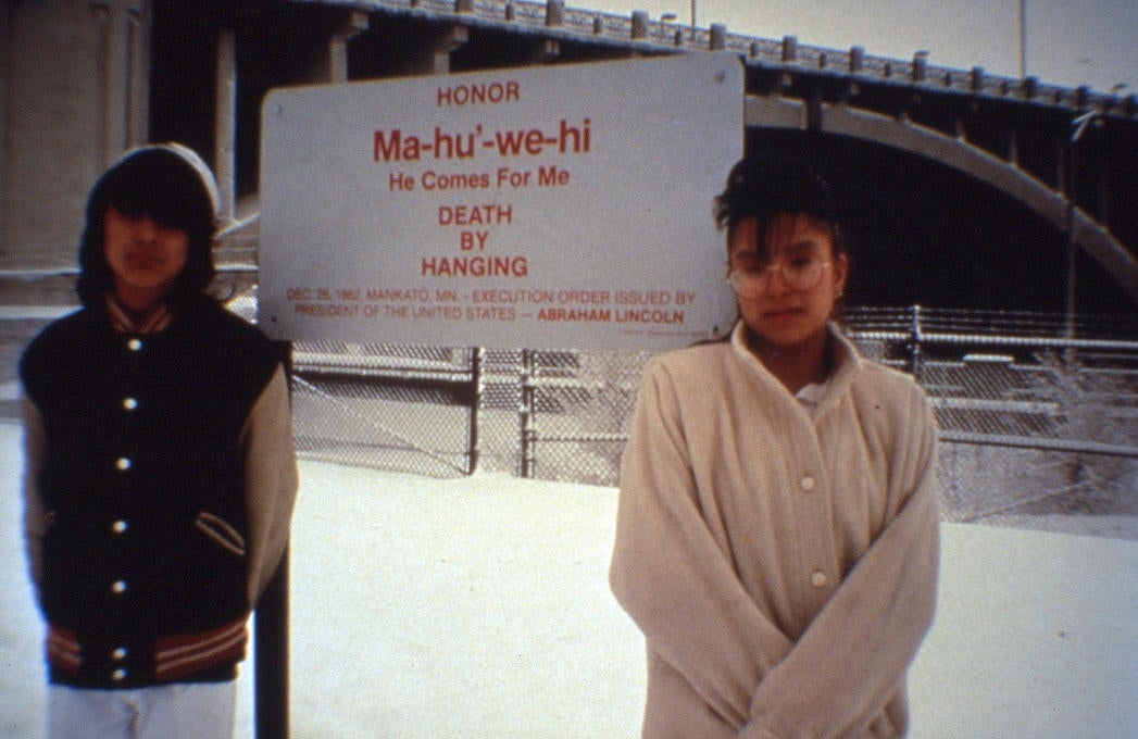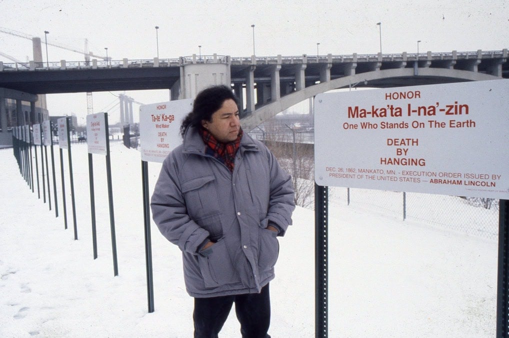 Hock E Aye VI—also known as Edgar Heap of Birds—is an artist of Cheyenne and Arapaho ancestry, best known for his public artworks across the United States correcting the established language around ownership, history, and geographic orientation. His Native Host series is comprised of large roadway-style signs that disorient our territorial understanding, reminding us that these places where we live had names long before we arrived or renamed them ourselves. In 1990, Hock E Aye VI completed Building Minnesota at the Walker Art Center in Minneapolis, memorializing the forty Dakota men who were sentenced to death after the Dakota Conflict of 1862, which remains today the largest mass execution in American history. Archival photos of the Building Minnesota project are haunting and devastating. Two Native teenagers stand under the sign bearing the name Ma-hu’-we-hi, whose name means He Comes For Me, and the sentence handed down, DEATH BY HANGING. The pose of the children is resigned. Though their eyes are hidden by their dark hair, their gaze is damning.