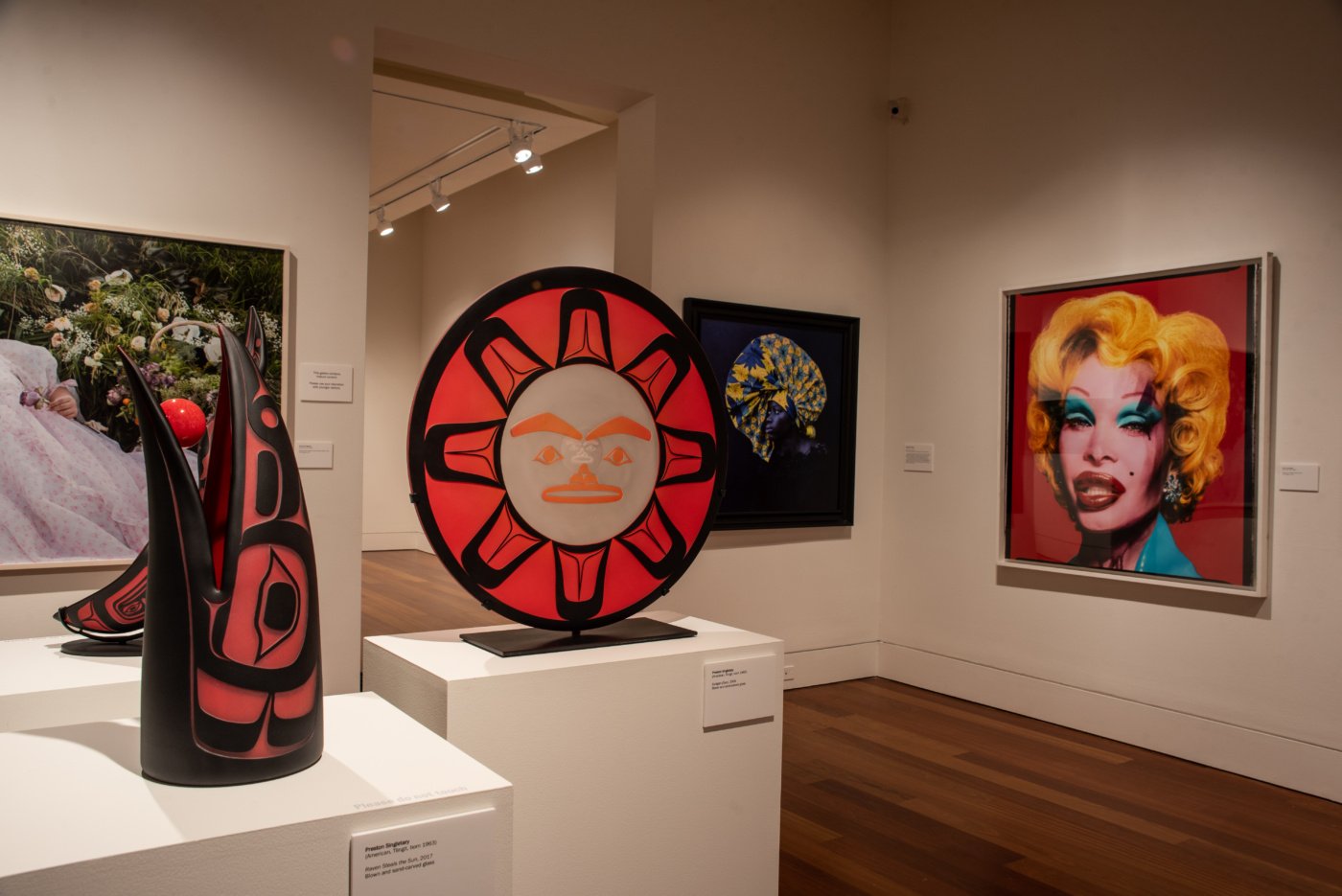 Upon entering the gallery, the exhibition’s title emerges from the neon lettering found in We Belong Here (2012) by Tavares Strachan. The show is bold in its presentation and contrasts, setting conceptual artists like Strachan next to large, blown-glass sculptures by Tlingit artist Preston Singletary, and abstract work like Carmen Neely’s oil painting, You’ve come a long way, baby (2022) beside graphic prints like David LaChapelle’s Amanda as Marilyn (Red) (2007).