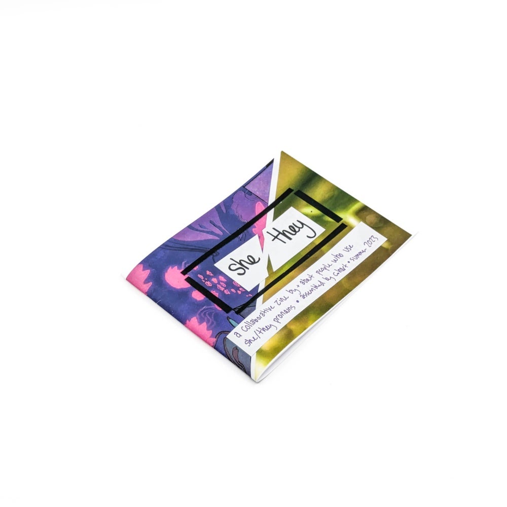 Within the collaboration process, hart isn’t interested in gatekeeping. They welcomed all the submissions from those that responded to the prompt. “It’s not about excluding anybody or having these rigorous standards for who gets in,” hart said. “The whole point is… you just have to have something to say.”2 She works intentionally to center the works of those that are contributing. “The call is always the first step,” hart explained that this comes before any of her illustrations or own writing begins. “Then I kind of see what other people contribute, and then I make my own thing towards the end.” In the instance of SHE/THEY, their contribution included a four page spread that put some of her own gendered associations to words.