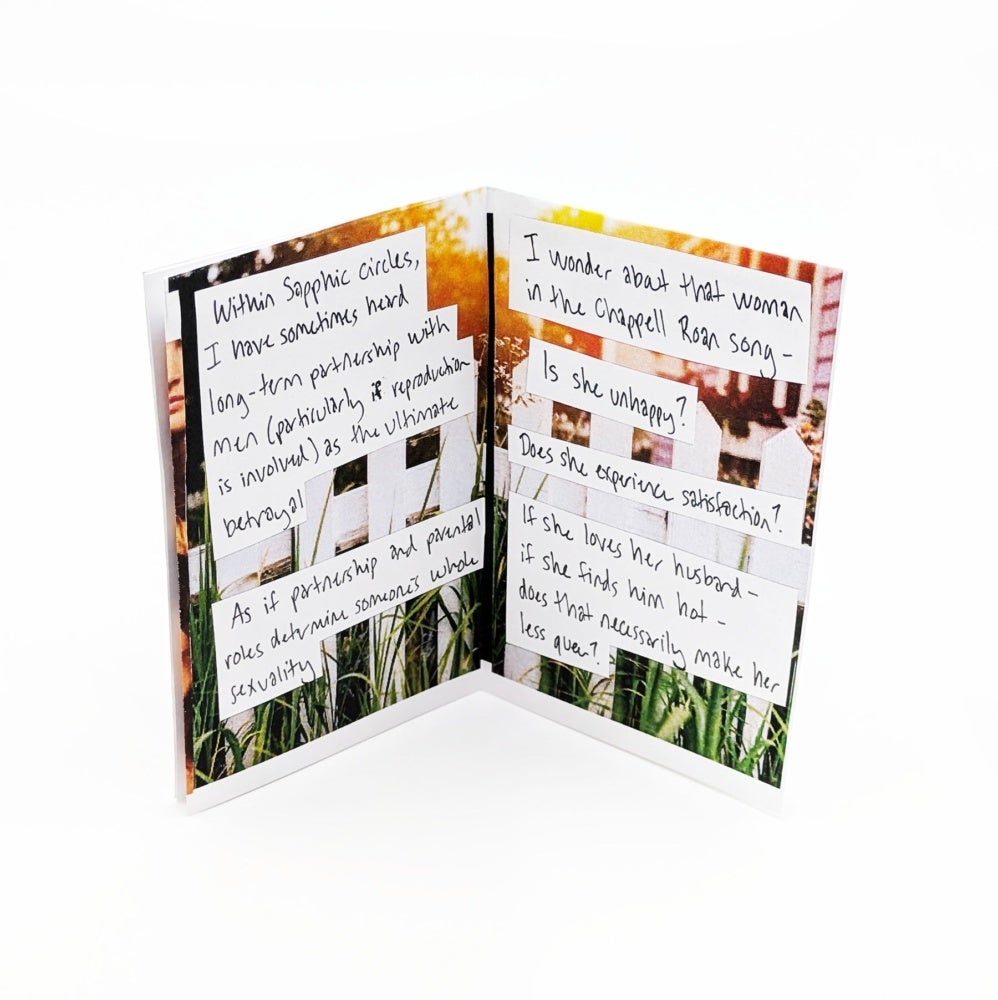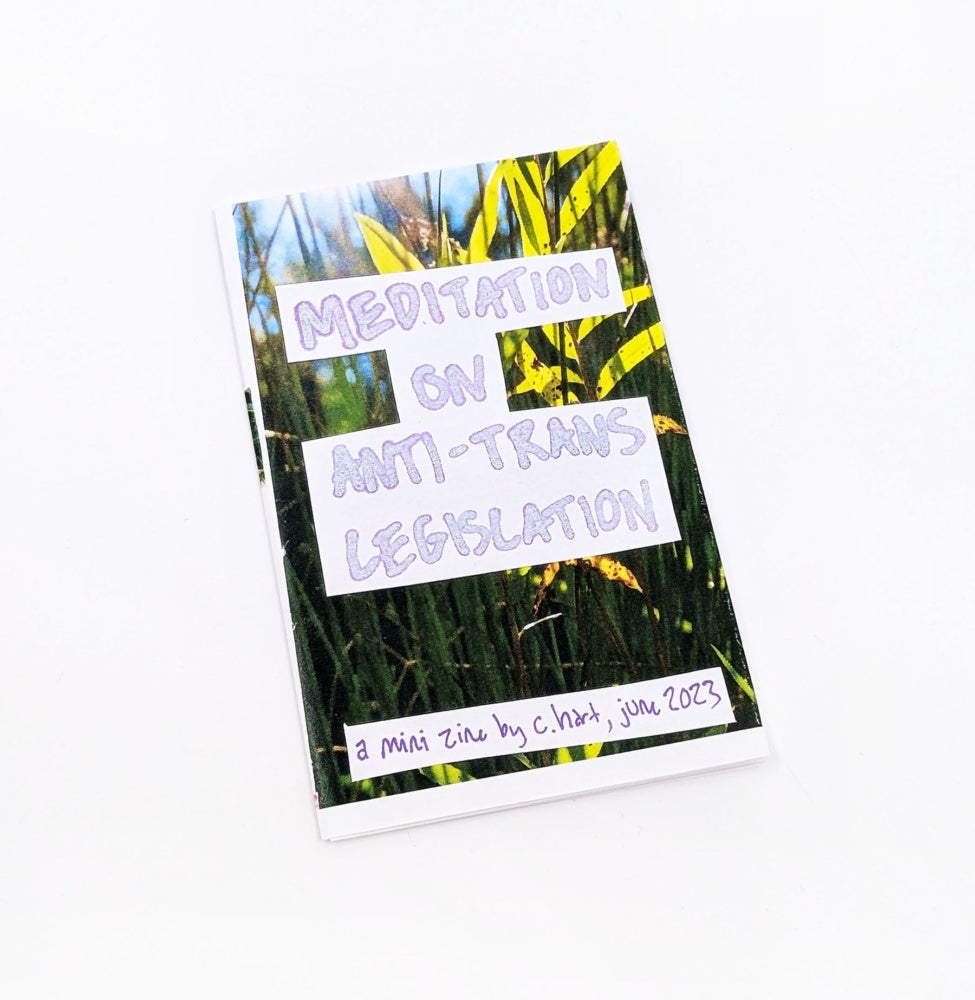 This same fashion of queering is also visible in Nothing More Than His Wife (2024). In this zine, hart explores a potential reading of latent biphobia in the lyrics of Chappell Roan’s song “Good Luck, Babe!” (2024).“I came of age during the run of The L Word (2004-2009)—I distinctly remember the characters glorifying ‘gold star lesbians’ (women who had never slept with men) and how much contempt Tina received when she dated a man… I internalized that contempt,” hart writes in the zine.4 They pull this thread towards Roan’s lyrics, closing with three contemplative questions for readers, “What would it take for her to be seen as queer? Does she get to have a say? Do we?” Hart leaves the question hanging, allowing readers to develop their own answers. Similar gestures are made in Meditations on Anti-Trans Legislation (2023) and My Hollins Experience Part 1 (2022) as the author ends the text in queried introspections and calls to action.